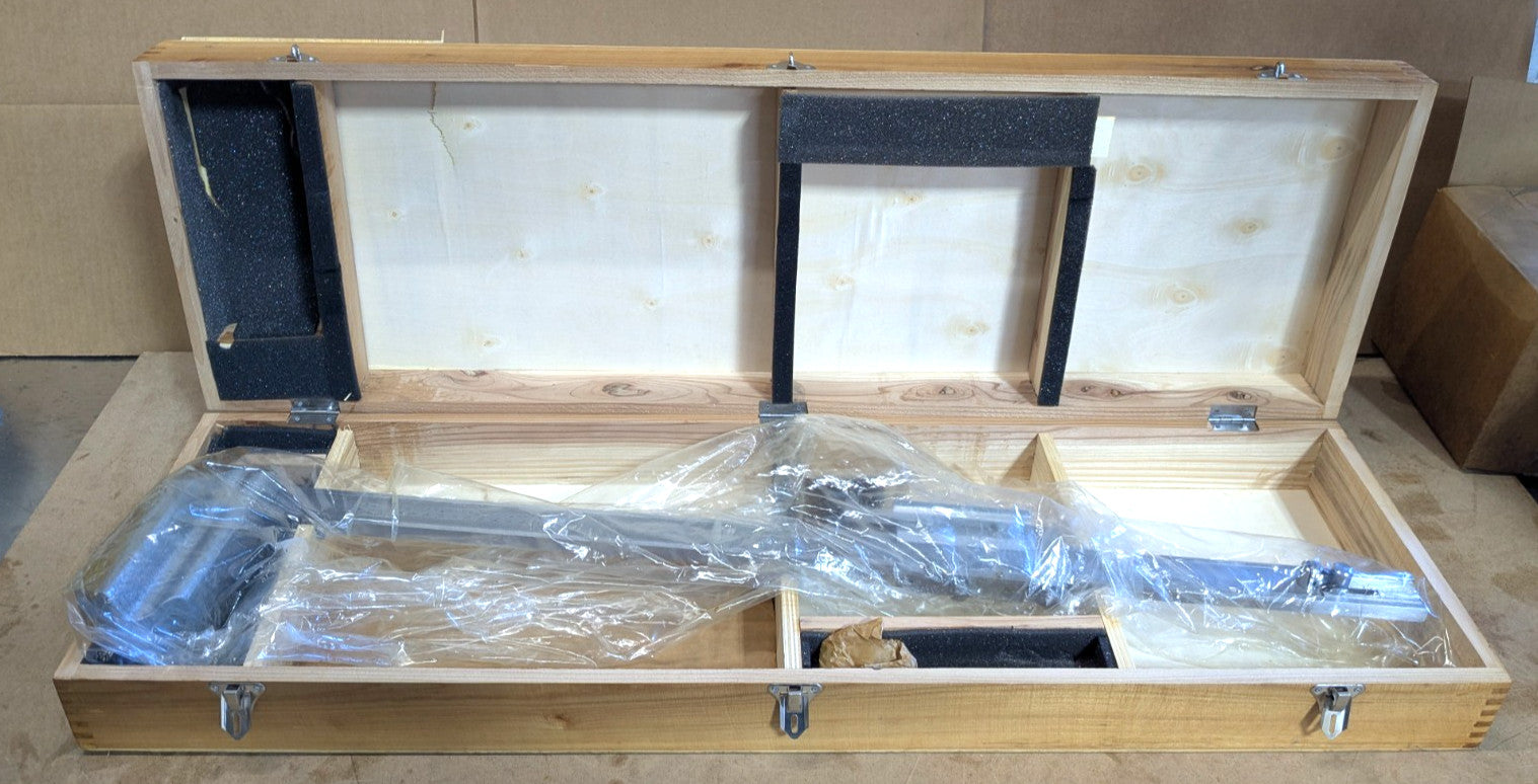This Stainless Steel Precision Adjustable Vernier Height Gauge is being sold as NEW/OPEN BOX. The original packaging and wooden storage case received some damage during shipping. The wooden storage case has split and cracked in a couple of spots, but it is still in usable condition.