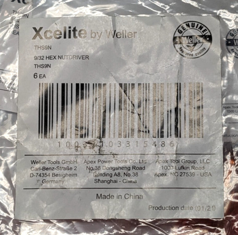 XCELITE Nut Driver 9/32" Drive Hollow Shaft 7-1/4" OAL THS9N **6 PACK**