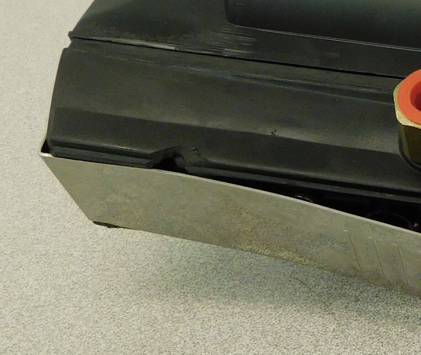 ***Release button is pushed in as shown. Metal cover does not sit correctly on item. Ding on item as shown***